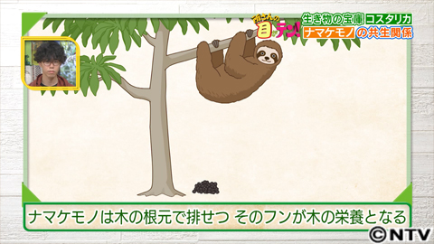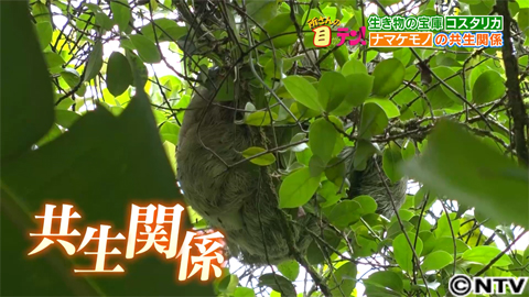 さらに、それだけではなくミユビナマケモノは、ガとも共生関係を築いているんです。ナマケモノのフンにガが卵を産みつけます。幼虫はフンの中で羽化し、成虫になると、飛んで木の上にいるナマケモノの毛の中へ。その毛の中をすみかとして、ナマケモノが出す分泌物を食べて暮らしています。ナマケモノはというと、ガの出す排泄物が肥料となり、ナマケモノ自身の体に藻が繁殖。この藻を、毛づくろいするときに、口から摂取することで、普段食べる葉っぱからでは取り入れられない脂肪分など重要な栄養源を得ることができているのです。ガはナマケモノをすみかとし、ナマケモノは、ガが作る藻を食べることで、互いに共生関係を結んでいたんです!