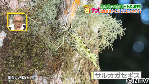 ツユムシの仲間。身体の柄や、全身にあるトゲがポイントで、コケに似た地衣類のサルオガセに身をひそめると、見事に溶け込んでしまいます。