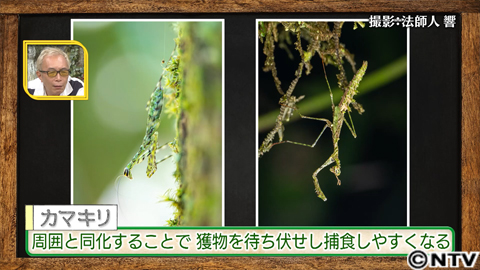 さらに、木の幹の上で擬態するカマキリ。コケなど環境や背景に擬態するのは、外敵である鳥などから身を守るため。さらに、カマキリは、小さな昆虫を食べる肉食昆虫であるため、周囲と同化して獲物を待ち伏せできるというメリットもあると考えられているんです。