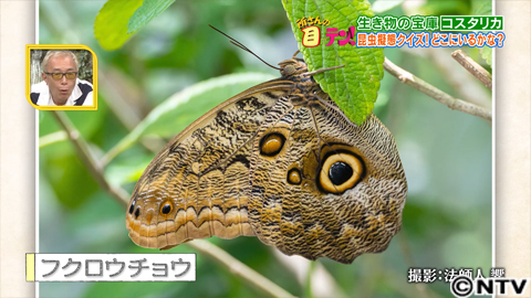 続いては、独特な擬態をする昆虫を紹介。フクロウの目玉に擬態をする昆虫は、フクロウチョウと呼ばれるチョウ。