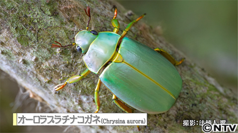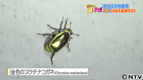 そして、いよいよライトトラップへ。ここで、バグボーイズが驚く貴重な昆虫に出会えたんです。そう、銀色に光り輝くプラチナコガネ。さらに、金色のプラチナコガネが。銀色とは違う、まばゆい色のプラチナコガネです。