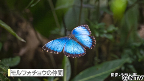 実はモルフォチョウの羽の色は、青い色がついているのではなく光の反射によって、色がついたように見える構造色によるもの。飛ぶ姿を見てみると、羽が青い宝石のように輝いているのが、よくわかります。