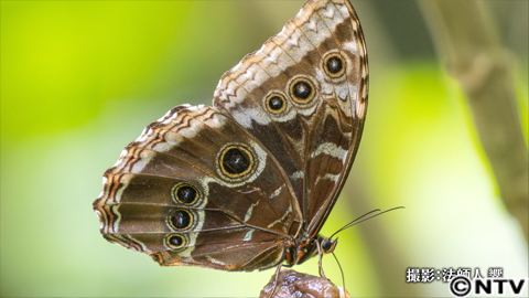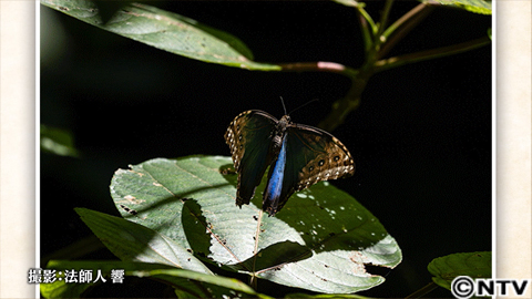 そして、モルフォチョウの構造色がよく分かる、決定的な瞬間の撮影に成功。見事に、青い羽が透けて、裏側の模様が見えています。