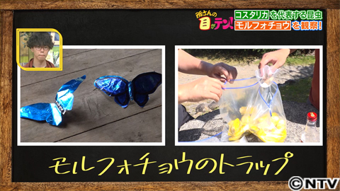 実はコスタリカに渡航する前、いかちゃんはかがくの里を訪れ、バグボーイズと一緒にトラップ作りを行っていたんです。光に反射するキラキラした紙を振ることで、モルフォチョウがナワバリにきた他のモルフォチョウと勘違いし、威嚇のために、近寄ってくるというんです。さらに、コスタリカに到着した初日。市場で購入したイースト菌。それと、バナナ、お酒、砂糖で発酵させたバナナトラップも用意。