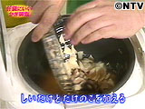 米にだし汁、調味料を加えて水加減し、一混ぜし、椎茸とたけのこをくわえて具をならしてから普通に炊飯する。 |