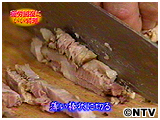 きくらげは水で戻して、いしづきを取る。紅茶豚を取り出して、たこ糸を切り、薄い棒状に切る。 |