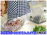 ボウルにゆでたそうめん、きくらげ、紅茶豚、玉ねぎを入れて混ぜ、レモン汁と紅茶豚のつけ汁、手でくだいたにんにくを入れて、更に混ぜる。 |