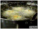 丸めて小麦粉、卵、パン粉の順に衣をつける。 |