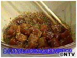 すり鉢でゴマをすり、醤油、みりんを入れタレを作り、その中にまぐろを入れ、味をなじませる。
