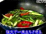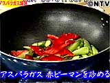 中華鍋に油を引き(分量外)、アスパラガス、赤ピーマン、塩