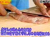 鶏のムネ肉を開き、包丁の背で軽く叩き、厚みを均等にする。
