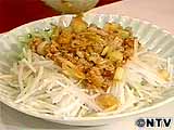 うどんを茹で、皿に盛り、茹でたもやし、千切りにした大根ときゅうり、肉味噌をかけて出来上がり。