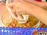 つぶしたじゃがいもの半量に塩、こしょう、カレー粉、1cm幅に切ったソーセージを加え、よくかき混ぜる。