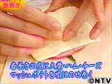 春巻きの皮に大葉、ハム、チーズ、マッシュポテトを順にのせ巻く。