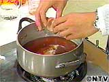 沸騰した湯に麺つゆ、酒、醤油、みりんを入れ味付けをする。