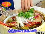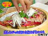 蒸し汁を一度捨て、金目鯛に白髪ねぎをのせ、タレをかける。