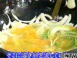 たまねぎとピーマンを炒め、そこにとき卵を流していく。