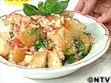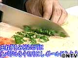 フランスパンを角切りにする。トマトはさいの目切り、玉ねぎはみじん切り、生バシルは千切りにする。