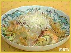 海老、白髪ねぎを盛り、冷やし中華のタレをかける