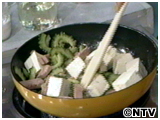 フライパンに水を1/2カップ程入れ、水にさらしたゴーヤを入れ、火にかける。 |