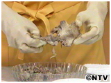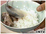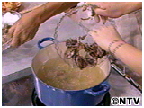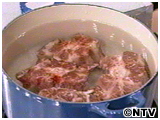 スープに塩(大1)で味付けして、ほぐした肉をスープに戻し、一煮立たせる