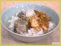ごはんに牛テールスープをかけ、キムチはたっぷりごはんの上にのせて、長ネギを盛る