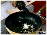 ニンニクをみじん切りにする。 フライパンにオリーブ油、たかのつめ、ニンニクのみじん切りを入れ、弱火できつね色に炒める。 |