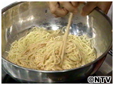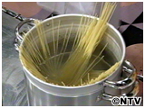 鍋に塩をたっぷり入れ、スパゲッティーをゆでる。 |