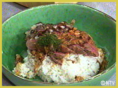 How3の肉を食べやすい大きさに切り、How1の椎茸ご飯を器に盛り、How4のソースを適量かけ、ステーキをのせる 揚げた舞茸としめじを盛りつけ、仕上げに大葉をのせる |