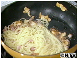 フライパンに茹であげた(5分間)スパゲッティを加えて、How2と絡める クレイジーソルト、白ワイン、こしょう、塩で味を調え、器に盛り、乾燥したバジリコをふりかける |