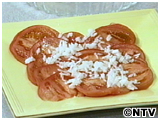 皿にトマトを盛り、玉ねぎをトマトの上にのせる |