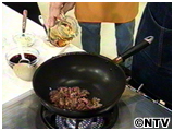 How2のオイル漬けにんにくをフライパンに入れ、にんにくの香りが出たら、塩・胡椒をし、一口大に切ったカルビ肉を加えて炒める |