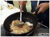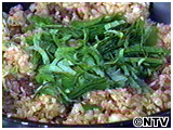 しょうゆ・酒を加え、ごはんを加えてよく炒める しょうゆはフライパンの縁から入れ、焦がして香りを出してから全体にからめる |