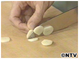 フライパンに油(大さじ1半)を入れ、にんにくのスライスをキツネ色になるまで炒め、にんにくは取り出して油切りをしておく。 |