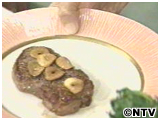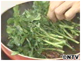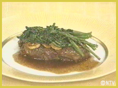 クレソンがしんなりしたら出来上がり。 お皿にステーキを乗せ、にんにくを乗せた上にクレソンを乗せる。 残りのソースを煮詰めてかける。 |