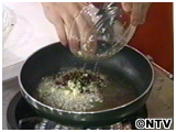 同じフライパンでにんにくのみじん切り、ししとうのみじん切り、ドライトマトのみじん切りをさっと炒め白しょうゆで味付けをする |
