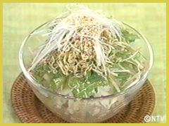 | How3 | 器に大根、人参、水菜の順に盛り、じゃこをかけドレッシングをかけて白髪ネギ、ごまをふる。 | |