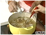 塩、化学調味料をいれ、さらに小麦粉大さじ2杯分を水で溶いたものを入れる。 |