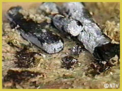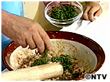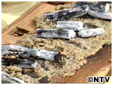 混ぜ合わせた具を板の上にのせ、その上に炭をのせて焼く。 |
