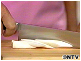 白ネギをななめに切る。 |