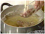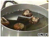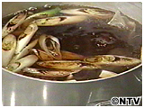 (3)を沸騰直前に昆布と椎茸を取り出しおばんざいとだし用の鴨を入れる。 |