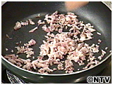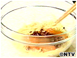 温めたボールにスパゲッティを入れ、ベーコン、卵黄を加えて混ぜる。 |