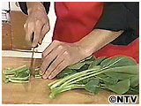油菜心を3つに切り、それぞれに分けておく。心の部分は短めに切る。 |