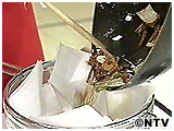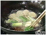 煮出したラードにしょうが、ねぎ、にんにくを入れ、ねぎが焦げるまで火にかける。 |