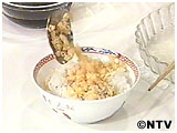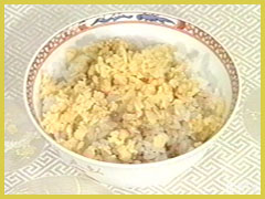 (2)のラードをごはんにかけ、醤油をかける。その上に炒り卵をのせる。 |
