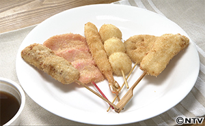 内容:串カツ牛、串カツ豚、紅しょうが、うずら、レンコン、エビ