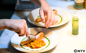 メイン :自家製スモークサーモンのミ・キュイ 温泉卵添え