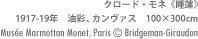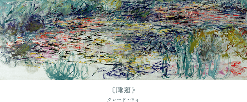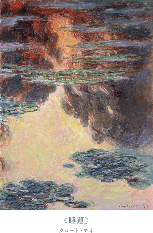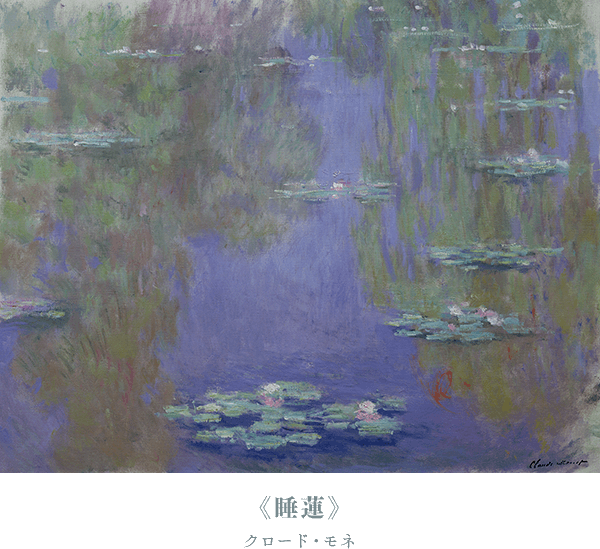 1893年、モネは自邸の向かいに新たな土地を購入し、水の庭を造り始めます。モネは、生涯で200点を超える睡蓮を描いたといわれ、季節や天気、時間、さらには描く視点を変えて移ろいゆく水面を捉えようとしました。