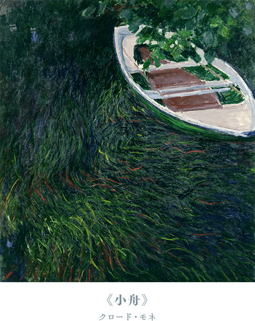 やや縦長の正方形に近い画面のほとんどを占めるのは、透明な川の底で光を反射する水草です。水草は、黄色や赤の筆触がまるで小さな魚の群れのように川の流れに揺れ動いています。誰もいない小舟と暗い川底のうごめきは、異世界のような少し不気味な雰囲気さえ醸し出しています。モネは水中の世界を描く難しさについて、次のように手紙に書き残しました。「川底で揺れ動く水草と水を捉えるという、不可能なことに取り組みました。それは眺める分にはすばらしいのですが、描こうすると気が狂いそうになります。」