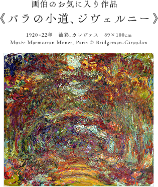 包み込まれるようなバラのアーチ。晩年に描いた絵。ジヴェルニーの地に大切な家族と暮らし、幾度となく通ってきたバラの道。その道は未来にも過去にもつながっているようで、ずっと見ていると絵の中に吸い込まれるかのようです。一歩一歩、地面を踏みしめて、時間という足跡を残したモネと家族の人生が描かれている気がします。